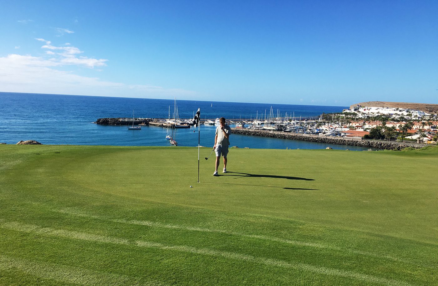 Ennen kuin jätän Gran Canarian ehdin pelata vielä Melonerasin viimeisen kerran. Mereltä tuulee jonkin verran, mutta aurinko paistaa ja ajattelen, ettei parempaa loppua lomalle voisi olla. Signature-väylällä numero 12, joka on upea Par 3 kohti Atlanttia, onnistun avaamaan palloni lähelle lippua ja saan birdieputtimahdollisuuden. Pelaan kierroksen erittäin hyvin ja harmittelen, että pitää jo lähteä kotiin. Kun ohitan klubitalon ulkoterassin, näen menomatkan vierustoverini edessään jääkylmä olut ja uusia ystäviä, joiden kanssa juttua tuntuu riittävän. Hän tuntuu todella nauttivan. Alan nyt itsekin ymmärtää miksi hän palaa taas luultavasti takaisin tänne ensi vuonnakin, kuten niin monet muutkin pohjoismaalaiset.