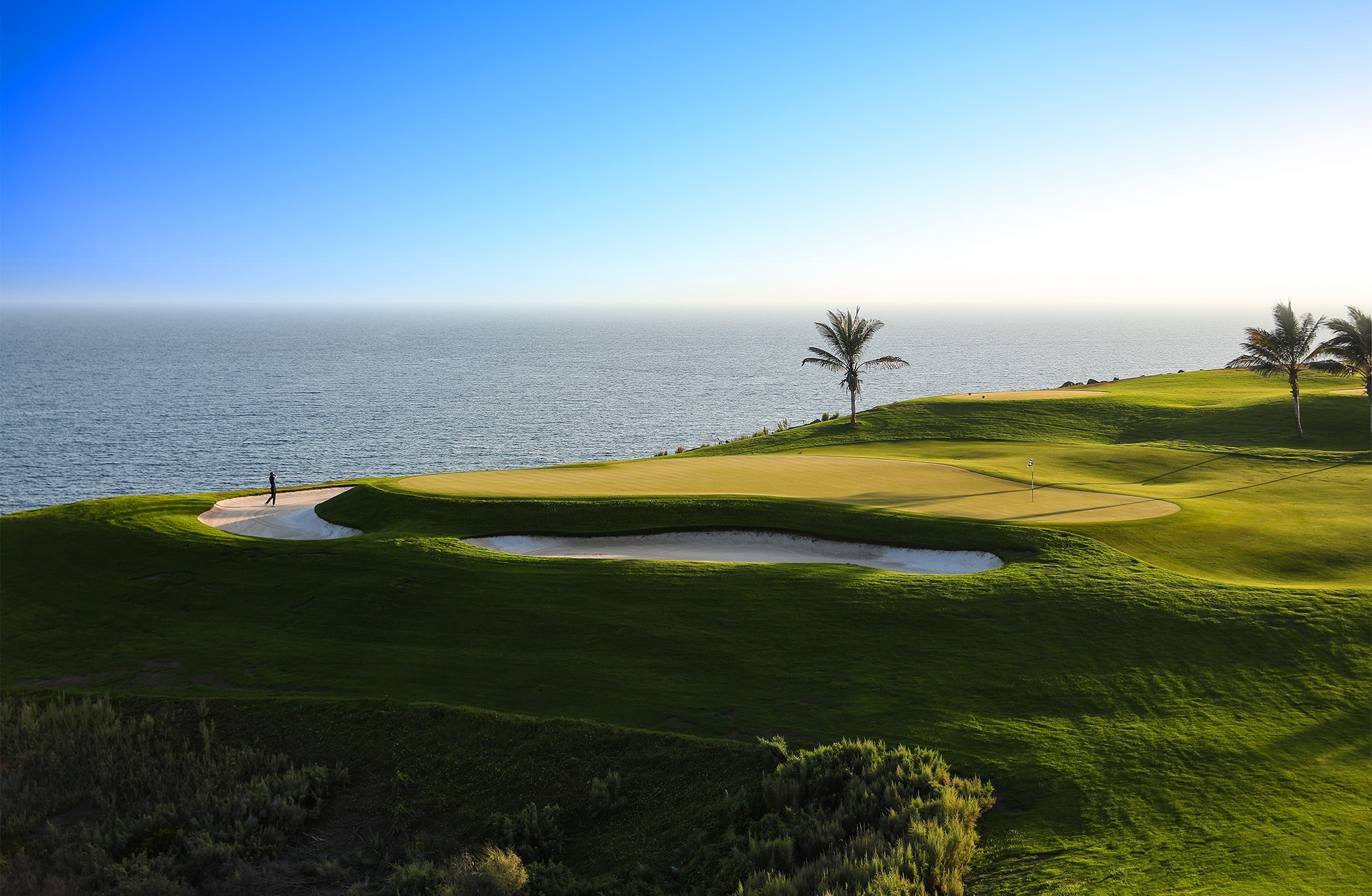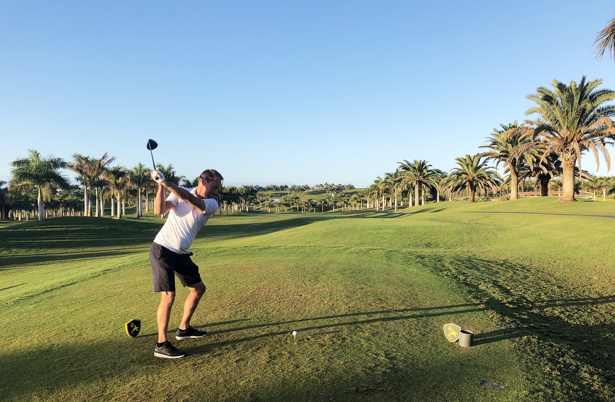 Meloneras on European Tourin isäntä vuodelta 2021 ja monet olivat yllättyneitä, kun pandemian keskellä kiertue kääntyi Kanariansaarille, missä ratkaistiin kolme kilpailua. Moni mietti, miten Melonerasin kaltainen erillinen turistikenttä toimisi ammattilaisten käydessä pelaamaan kenttää? Vaikka tulokset olivat alhaiset, golfkenttä hyväksyttiin hienosti osaksi ammattilaiskiertuetta. Tiedän, että Gran Canarian ylpeyden ja moninkertaisen Euroopan kiertueen voittajan Rafa Carbrero Bellon kotikenttä oli aiemmin Meloneras. Ja hieman tarkemmin jos katsoo kenttää niin löytää niin sanotut “Rafan teet”” jotka ovat hyvän matkan takana perinteisten takatiiden takana. Kilpailun aikana nämä lyöntipaikat tuli hyvään käyttöön, sillä perinteisiltä takatiiltä kentällä on mittaa ainoastaan 5946 metriä, joka on lyhyimpiä kenttiä mitä on European Tour -kiertueella. Ei ole ensimmäinen kerta, kun lähden pelaamaan Meloneraksen kenttää, joten tiedän mitä odottaa. Tämä on kenttä jolla on kahdet kasvot. Etuysi suuntaa sisämaata kohti ja meri näkyy vain paikka paikoin. Tuhannet palmut erottavat väylät tyylikkäästi toisistaan.