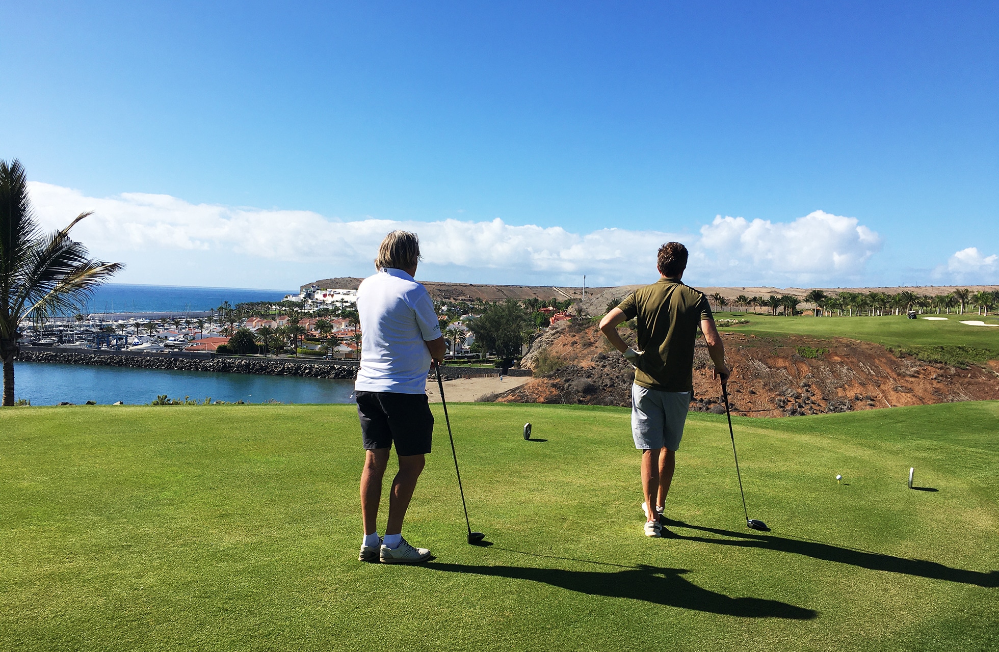 Hän huomaa että olen hieman hämmentynyt, joten hän osoittaa poolopaitaani, jossa on logo Ryder Cupista Le Golf Nationalissa, ja ymmärrän, mikä paljasti minut. Hän kysyy, pelasinko golfkenttää vai olinko siellä Ryder Cupin aikana. Siinä vaiheessa ymmärrän, että lennolla ei katsota niin paljon elokuvia kuin luulin. Osoittautuu, että hän on ollut liimautunut televisioon koko Ryder Cup -viikonlopun ajan ja näyttää tietävän jokaisen pienen mutkankin kentällä. Käy myös selväksi, että yksi hänen suurista golfunelmistaan on pelata tätä mestariteosta. Meillä on aika mukavat keskustelut ja saan tietää, että tämä ei ole ensimmäinen kerta, kun hän vierailee Kanariansaarilla, vaan pikemminkin kymmenes kerta. Minusta se kuulostaa paljolta, mutta saan tietää että 9/10 ruotsalaisista on käynyt Kanariansaarilla. Tällä matkalla hän vierailee Meloneras Golfissa ja tämä on jo viides vuosi peräkkäin. Suureksi yllätyksekseni Meloneras oli ainoa golfkenttä, jonka hän on pelannut Gran Canarialla. Selitän, että minä sekä pelaan että pidän Melonerasista, mutta olen hänen totaalinen vastakohta, koska haluan aina kokea jotain uutta ja saada mahdollisimman monta uutta kenttää bongattua ja pelattua. Hän vakuuttaa minulle, että ymmärrän, miksi hän palaa aina takaisin, jos viivyn Melonerasissa pidempään kuin yhden päivän ja pelaan enemmän kuin kierroksen golfia.