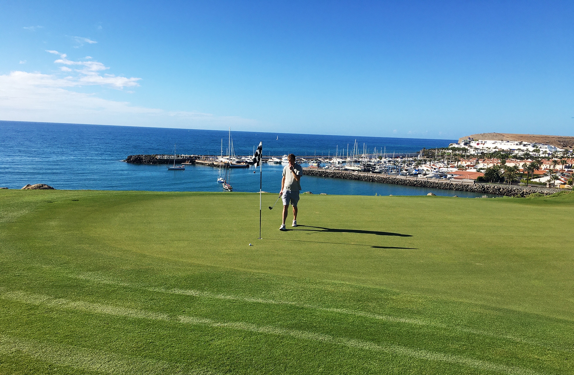 Ennen kuin jätän Gran Canarian ehdin pelata vielä Melonerasin viimeisen kerran. Mereltä tuulee jonkin verran, mutta aurinko paistaa ja ajattelen, ettei parempaa loppua lomalle voisi olla. Signature-väylällä numero 12, joka on upea Par 3 kohti Atlanttia, onnistun avaamaan palloni lähelle lippua ja saan birdieputtimahdollisuuden. Pelaan kierroksen erittäin hyvin ja harmittelen, että pitää jo lähteä kotiin. Kun ohitan klubitalon ulkoterassin, näen menomatkan vierustoverini edessään jääkylmä olut ja uusia ystäviä, joiden kanssa juttua tuntuu riittävän. Hän tuntuu todella nauttivan. Alan nyt itsekin ymmärtää miksi hän palaa taas luultavasti takaisin tänne ensi vuonnakin, kuten niin monet muutkin pohjoismaalaiset.