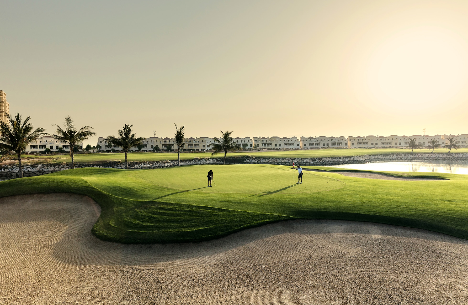 Ilta tummenee täällä nopeasti ja pidentääksesi pelejä, kenttä on varustettu valonheittimillä, jonka ansiosta golfista on mahdollisuus nauttia myös iltaisin. Valaistu osa kattaa reiät 1-7 ja 17-18, mikä antaa jännittävää vaihtelua pelkkien tähtien loisteessa pelaamiseen. Paikan bravuuri on luultavasti 18. reikä, joka on vaikea par 5., jossa on vettä oikealla ja viheriö klubitalon edessä sijaitsevan terassin lähellä. Toisen ja kolmannen reiän taustalla näkyy Waldorf Astoria -hotelli, joka muuttuu entistä vaikuttavammaksi valaistuna. Hienoja ovat myös väylät 10 -13, jotka kulkevat merialueen ympäri.