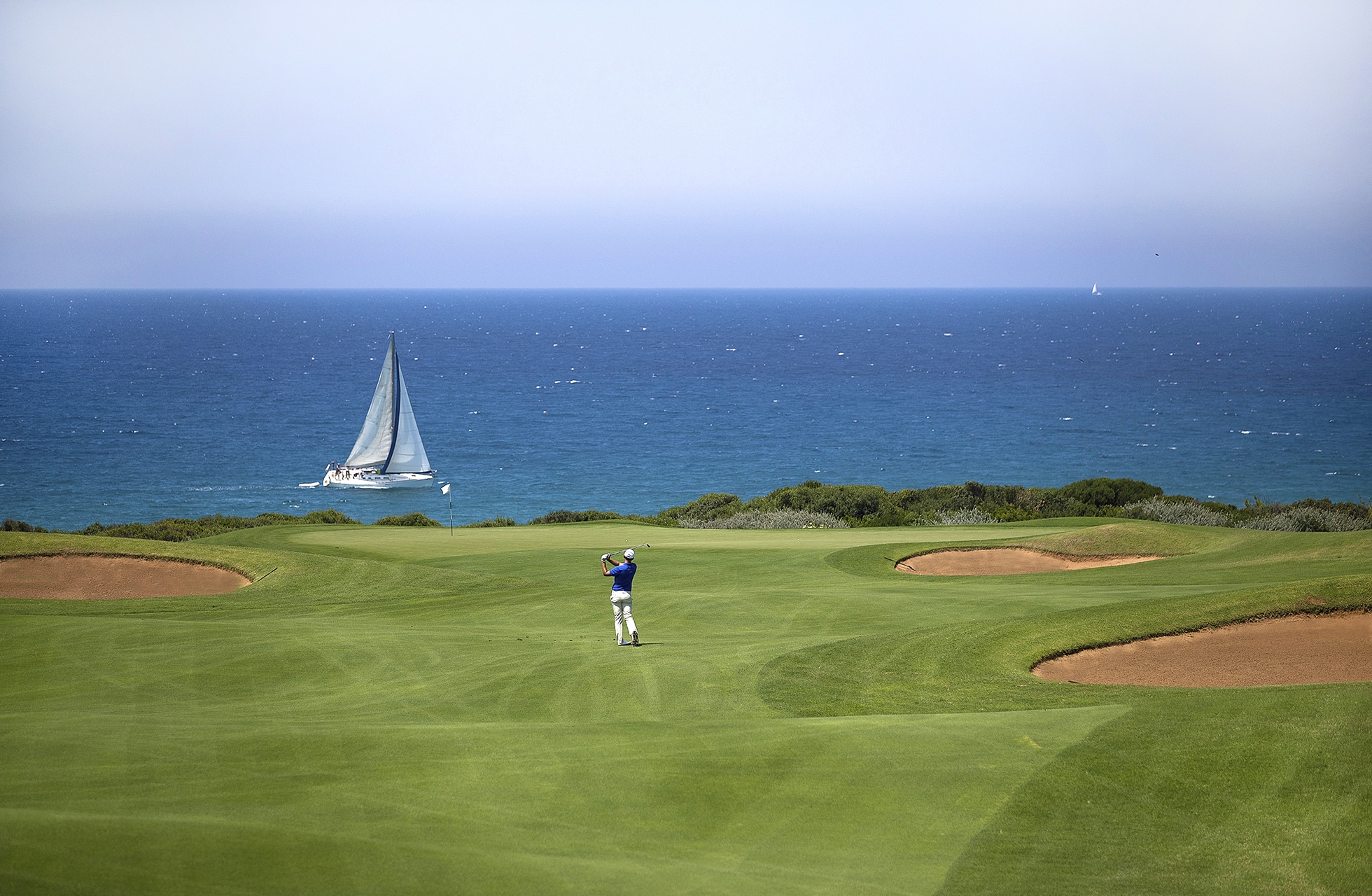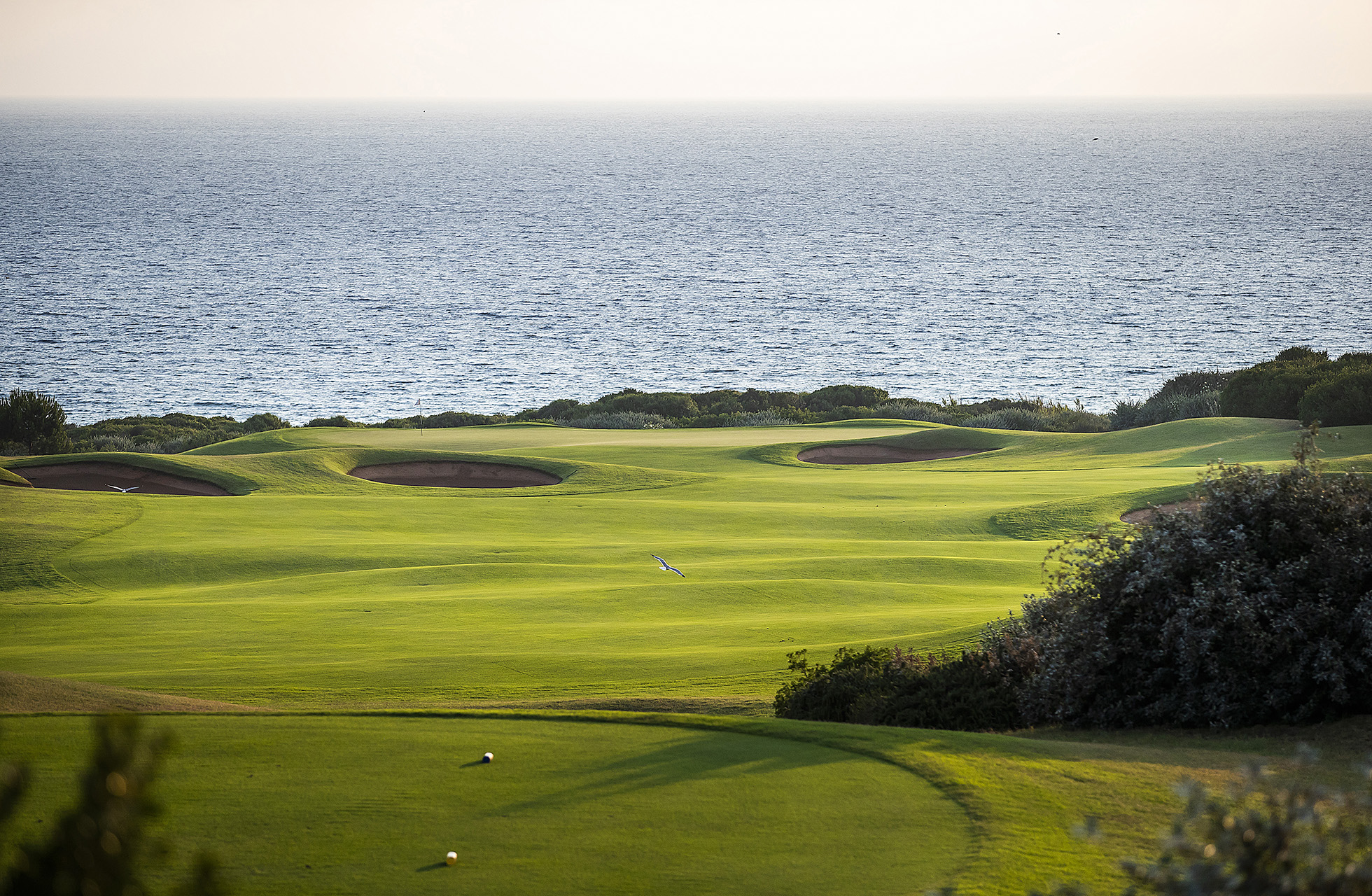 Tietenkin kaikilla golfkentillä on oltava oma Signature-väylä, mutta Olympicissa ehdokkaita on kaksi, nimittäin on vaikea valita kahden par 3 -reiän välillä, jotka molemmat kulkevat kallion reunaa pitkin, ja näkymä Navarinon lahdelle on järjettömän upea. Juuri väylät 12 ja 16 ovat osittain samanlaisia, mutta kulkevat vastakkaiseen suuntaan, mikä on merkki siitä, että Olazábal on suunnitellut kaiken tarkkaan harkiten. Se, että rei’illä on eri tuulensuunnat, tarkoittaa, että sinun vierailijana täytyy hallita useita erilaisia lyöntejä ja väylät voidaan kokea täysin eri tavalla riippuen päivästä ja hallitsevasta säätilasta. Sijainti korkealla merenpinnan yläpuolella ei vain tarjoa vertaansa vailla olevia näkymiä, vaan tekee myös tuulesta peliin oleellisesti vaikuttavan ja tärkeön huomioitavan tekijän pelatessa. Osittain tästä syystä Olazábal on päättänyt antaa Olympic Courselle hieman leveämpiä väyliä ja suurempia viheriöitä kuin hän perinteisesti suunnittelee.